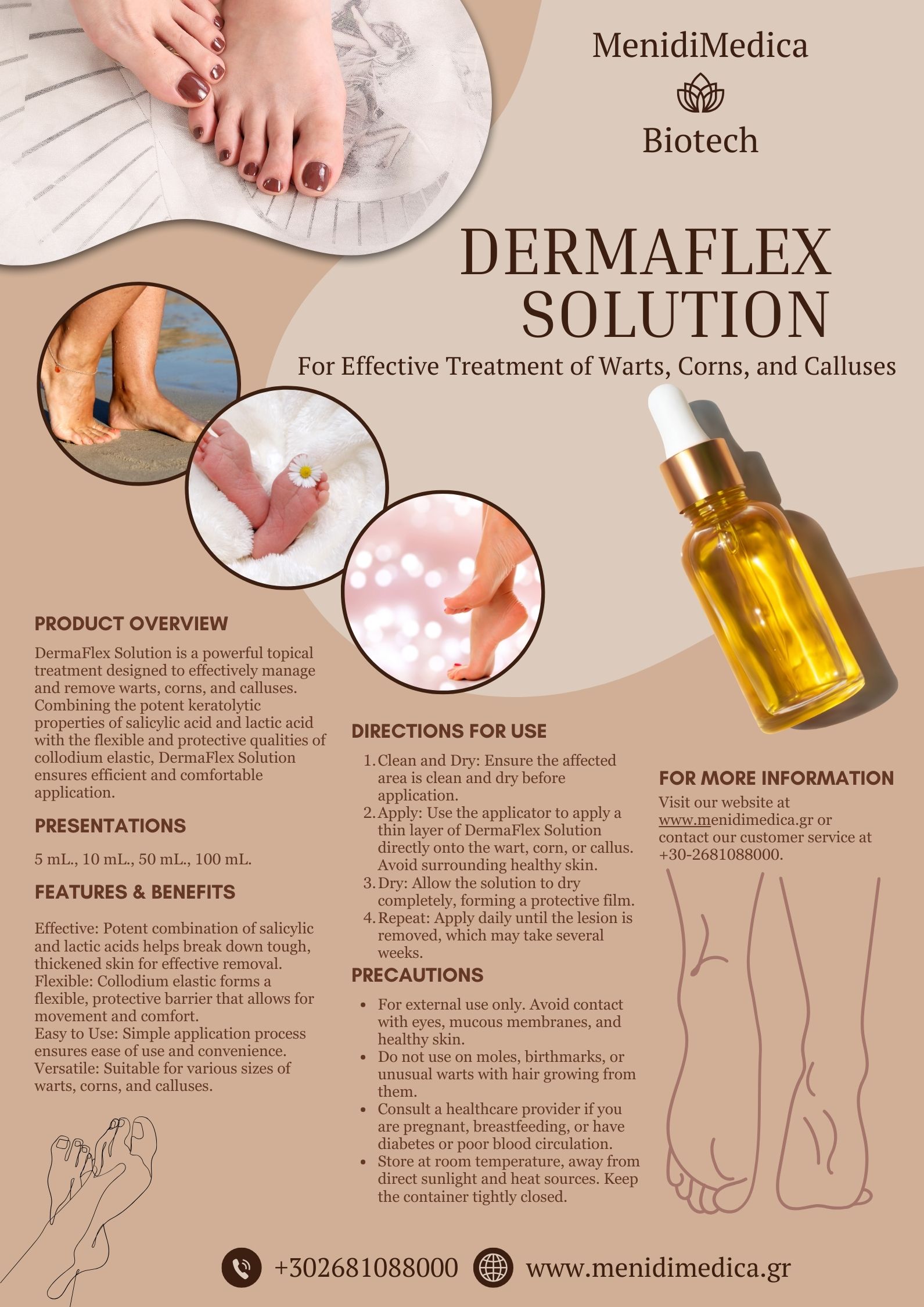 Να διαβάζετε πάντα την ετικέτα και να ακολουθείτε τις οδηγίες που παρέχονται στο DERMAFLEX SOLUTION/κάλοι-μυρμηγκιές-κονδυλώματα. Συμβουλευτείτε το γιατρό ή το φαρμακοποιό σας εάν έχετε οποιεσδήποτε ανησυχίες ή ερωτήσεις σχετικά με τη χρήση αυτού του προϊόντος.